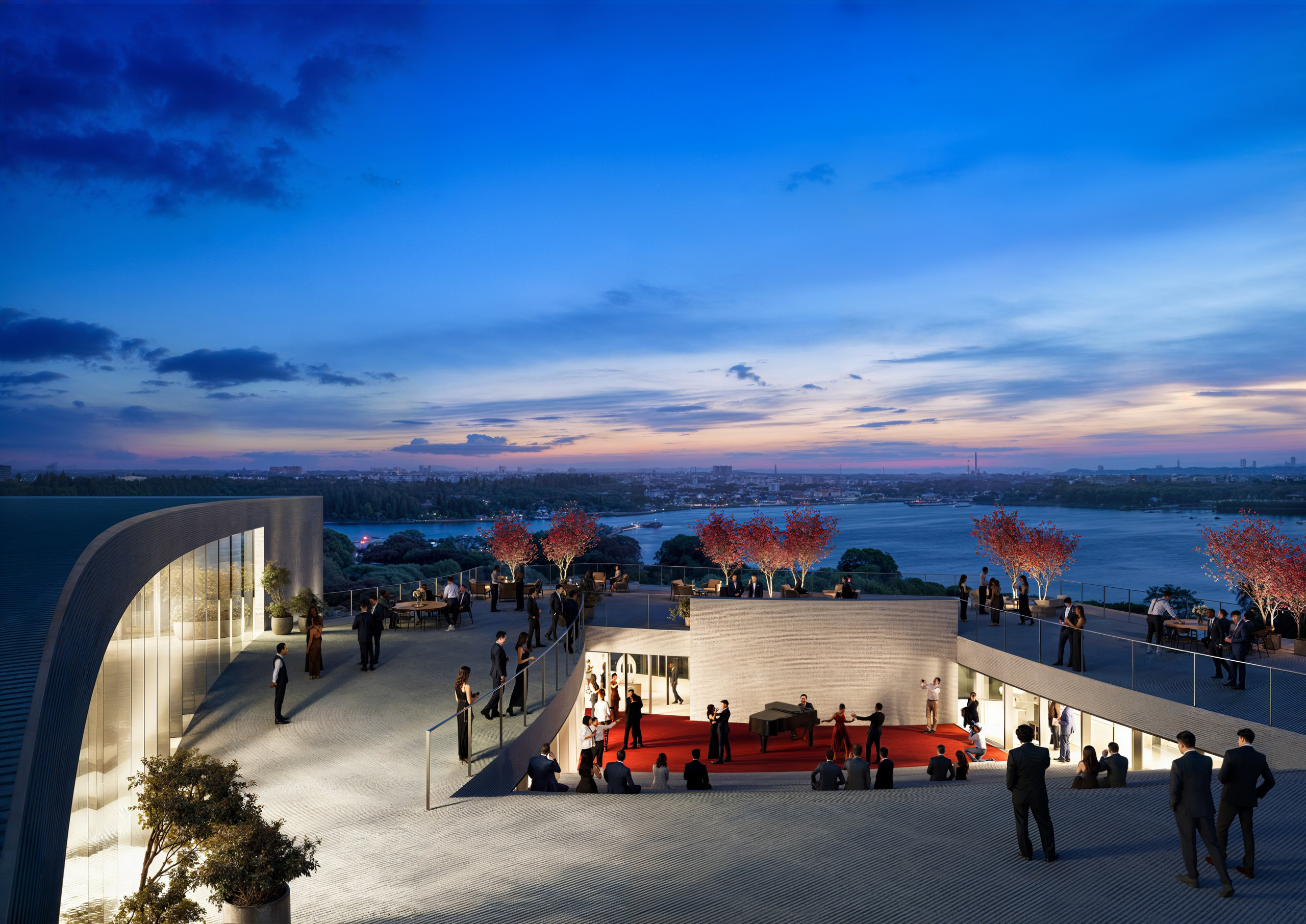 涟漪聚场的布局充分考虑了周边景观的融入。建筑的曲线设计灵感源自湖面的涟漪波纹,这些曲线造型环抱着环境中的重要景观节点,如广场和花园,形成一个有机的整体。建筑曲线形态在不同的光线和天气条件下展现出丰富的变化,创造出一种流动的视觉效果,仿佛与湖水和山脉进行着一场无声的对话。
